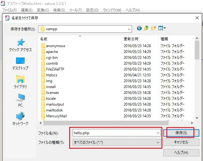 ファイルの種類を「すべてのファイル*.*」にして、ファイル名の拡張子を「*.PHP」として保存します。
